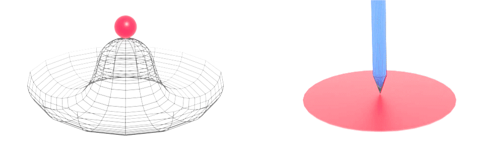 图5. (左图) “墨西哥帽”形状的希格斯场中的粒子和(右图)用笔尖站立的铅笔。展示了自发对称性破缺——对称,但瞬间破缺