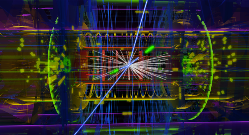 注:这是一个希格斯玻色子从对撞中产生并发生衰变时的场景,CMS实验中用于具象展示对撞事例的软件就叫做Fireworks,参考网页[6]可以使用CMS opendata看到2012年采集的具体事件