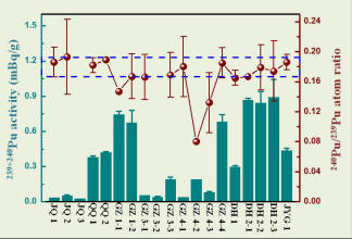 钚是与核武器和核工业密切相关的人工放射性核素,上世纪有核国家开展的大气层核试验是全球环境中存在的钚核素的主要来源。在核试验场周边地区,除了全球放射性沉降的钚以外,还存在着来自局地核试验场的贡献。郭秋菊课题组长期致力于我国环境中放射性核素的研究,近年来对我国核试验下风向甘肃酒泉地区土壤中钚核素进行系统深入研究。利用电感耦合等离子质谱法(ICP-MS)对土壤样品中钚的放射性活度和240Pu/239Pu原子比值进行了精确分析,首次报道了该地区土壤中钚的活度水平、沉积通量分布和同位素比值特征,并首次对钚核素在我国土壤中的迁移速率进行了实测和预测。