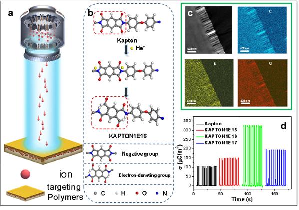 图1. 离子束辐照改性高分子材料机理与电学性能:(a) 离子束辐照材料示意图;(b) 辐照引起Kapton材料化学结构发生旧键断裂与新键形成,并产生电子给体基团-酰胺基的示意图;(c) 辐照前后材料的表面结构的透射电子显微镜(TEM)和能谱(EDS)图;(d) 对比表明,材料经适当离子辐照剂量后有效电荷传输密度显著提高。