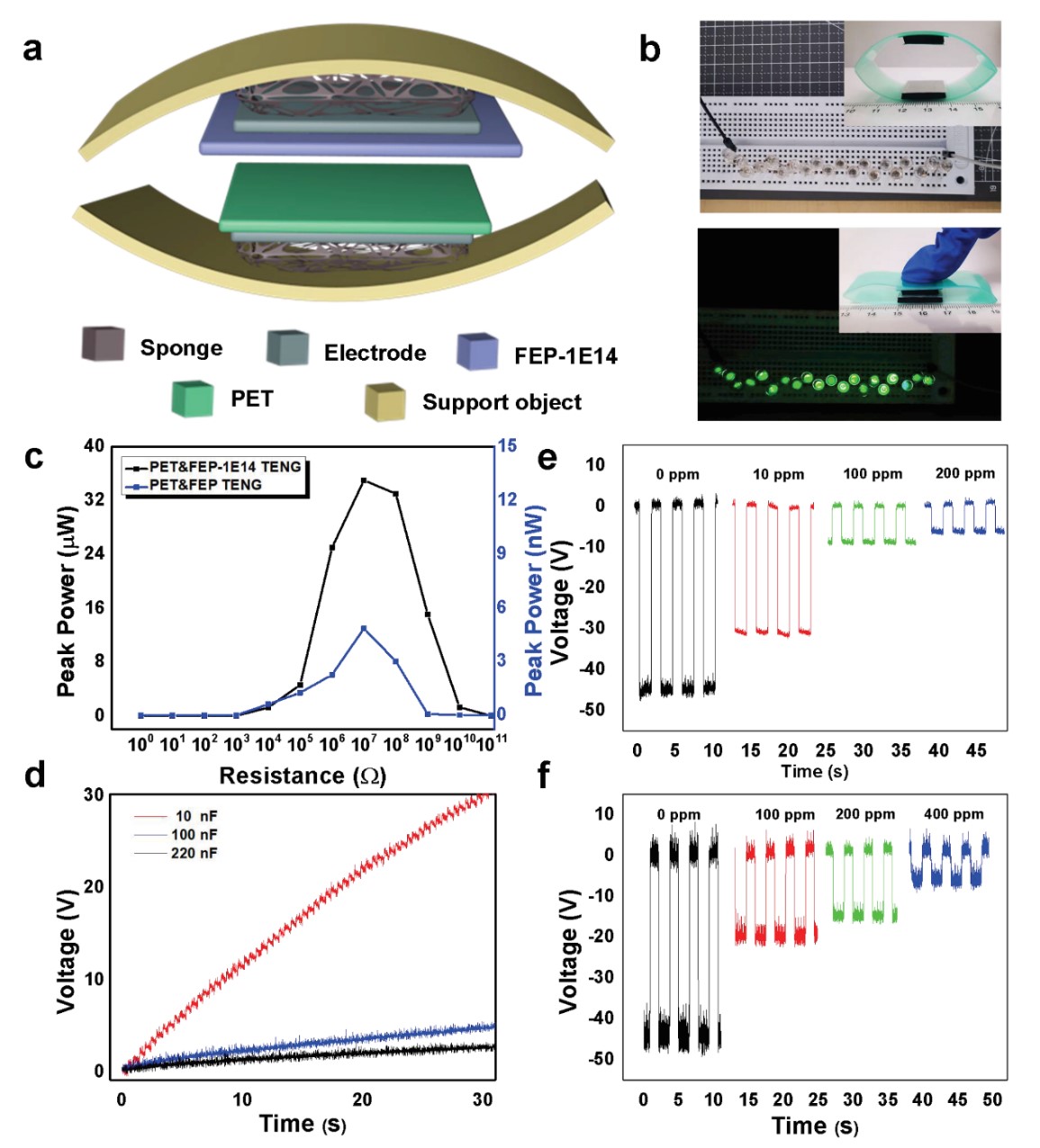 图3. PET& FEP-1E14 柔性TENG的应用。(a)设备示意图。(b)基于(a)的真实设备图片,可连续点亮20个LED灯。(c)峰值功率对电阻的依赖性。(d)使用该设备时不同电容器的充电电压曲线。气体浓度检测应用:当接触不同浓度的乙醇气体(e)和(f)水蒸气时,输出不同感应电压