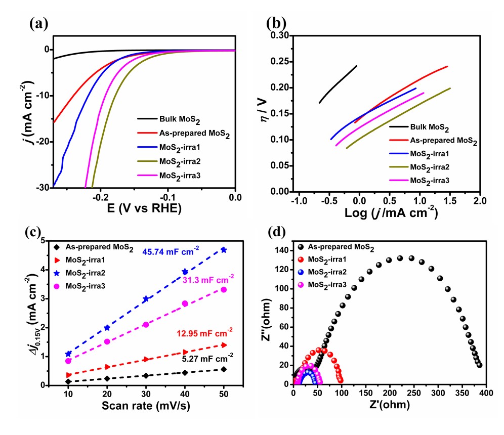 图2 块体MoS2、未辐照MoS2、辐照剂量分别为5 × 1012 cm−2, 2 × 1013 cm−2和5 × 1013 cm−2的二硫化钼纳米片的(a)极化曲线以及(b)塔菲尔斜率;(c)使用循环伏安法获取的双层电容;(d)不同样品的电化学阻抗图