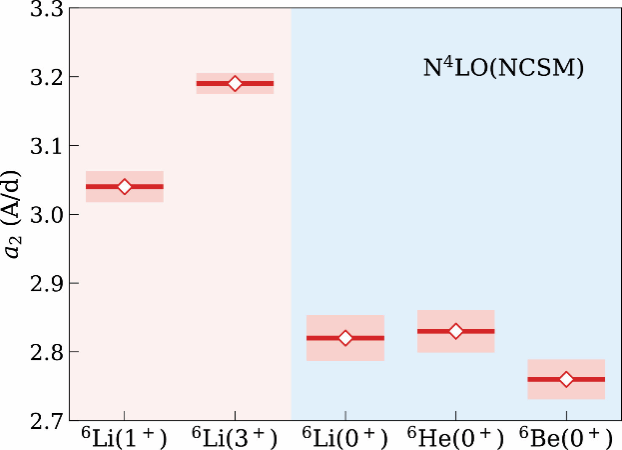 在该工作中,基于NCSM计算得到了轻核的高动量密度分布,抽取的标度因子能很好地重现实验结果。进一步对6Li不同核态的计算发现,其同位旋三重态的标度因子与6Be, 6He基态的标度因子很接近。此前经验模型认为标度因子正比于N×Z/A。计算结果与经验公式并不完全一致,体现了核多体效应对SRC的影响。此外6Li同位旋单态的a2明显大于其三重态的a2。分析发现,6Li两个价核子处于不同核态时,a2与其类氘成分相关,但是某些核态对形成类氘成分有压低作用。课题组的研究表明超越平均场的多体关联对精确计算核内短程关联成分有重要影响,这为未来高精度的实验测量提供了理论基础,最终有望实现对核内夸克效应的定量认识。