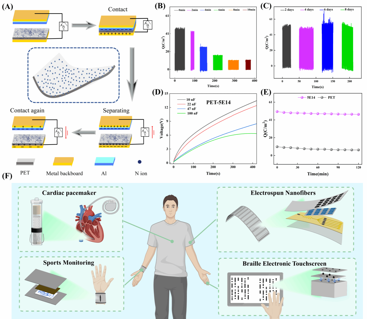 图2. (A)TENG的结构与工作方式示意图;纯电荷注入PET(B)与PET-5E14(C)的电性能长寿命实验;(D)改性的PET充放电性能;(E)PET-5E14电性能经过36000次循环保持稳定;(F)基于高性能智能柔性起电材料的可应用领域。