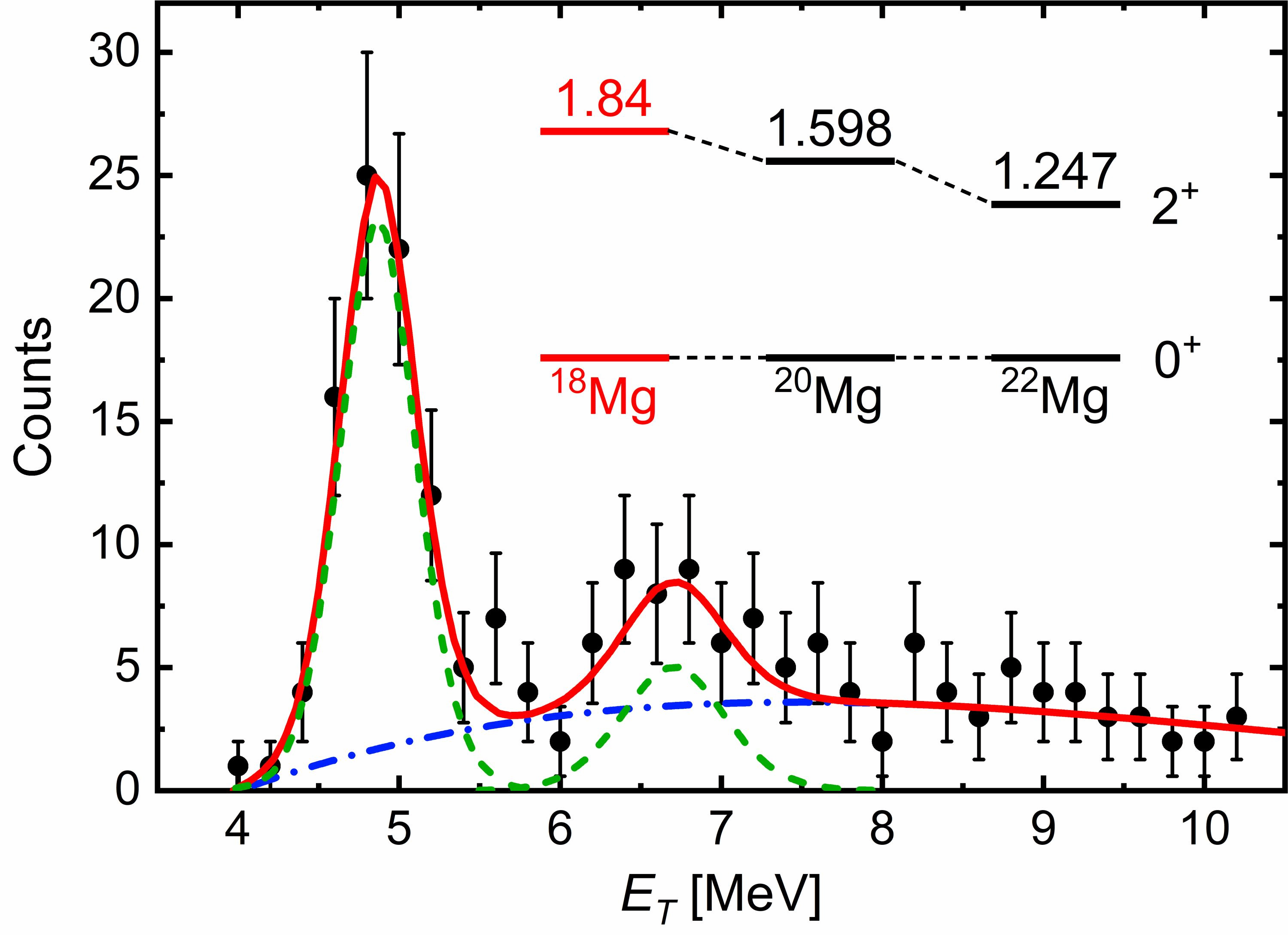 图2: 本实验中重建的18Mg不变质量谱及Mg同位素中2+态激发能的系统性演化