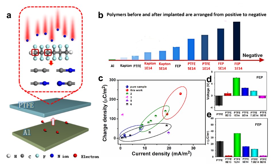 图1. 超负起电材料的优异性能:(a)离子注入调控分子结构示意图;(b)起电材料负电性排序,其中原始FEP是已报道的最负起电材料;(c)离子注入后的样品比之前的研究工作表现出更优异的表面传输电荷和输出电流;(d)和(e)离子注入后的样品与原始FEP组合成TENG器件输出的电荷密度和电压