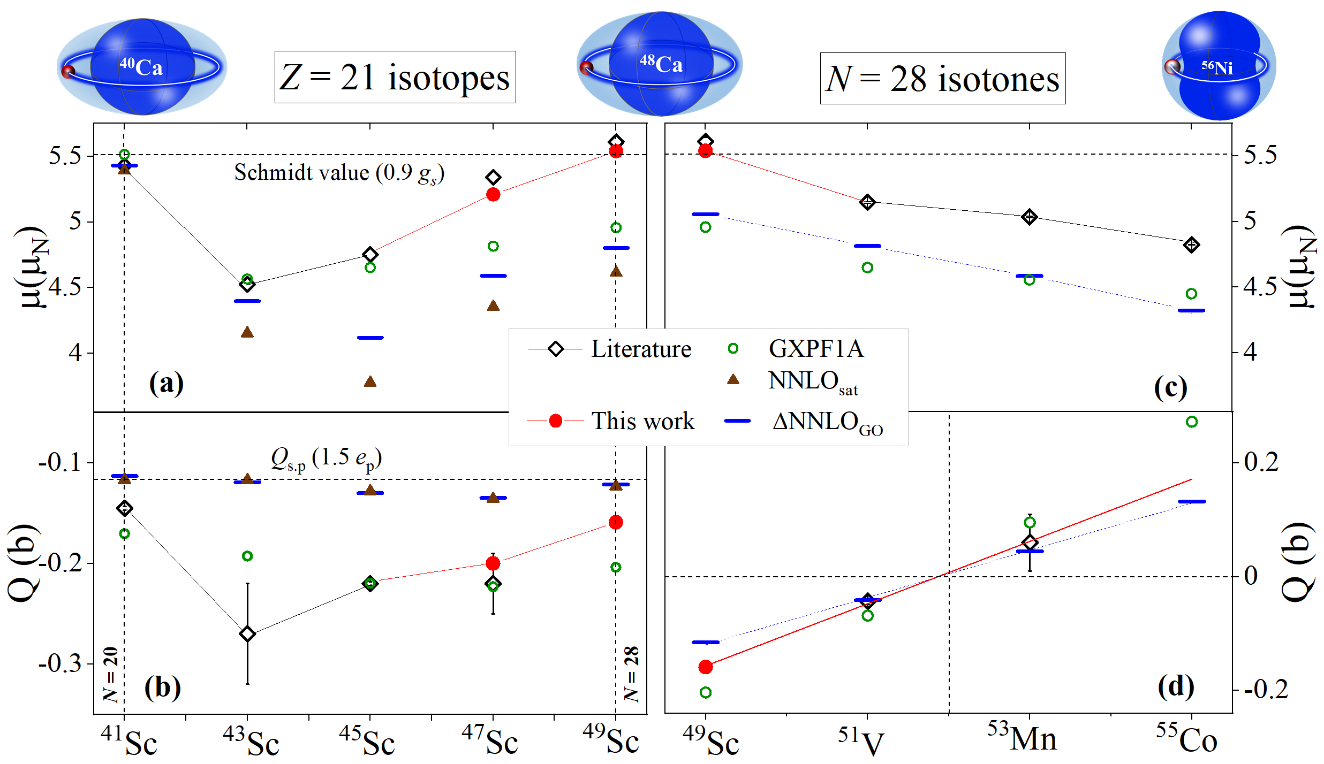 图1:幻数20和28之间, Z = 21同位素和N = 28同中子素的磁矩和电四极矩,与现有两种核理论计算结果对比
