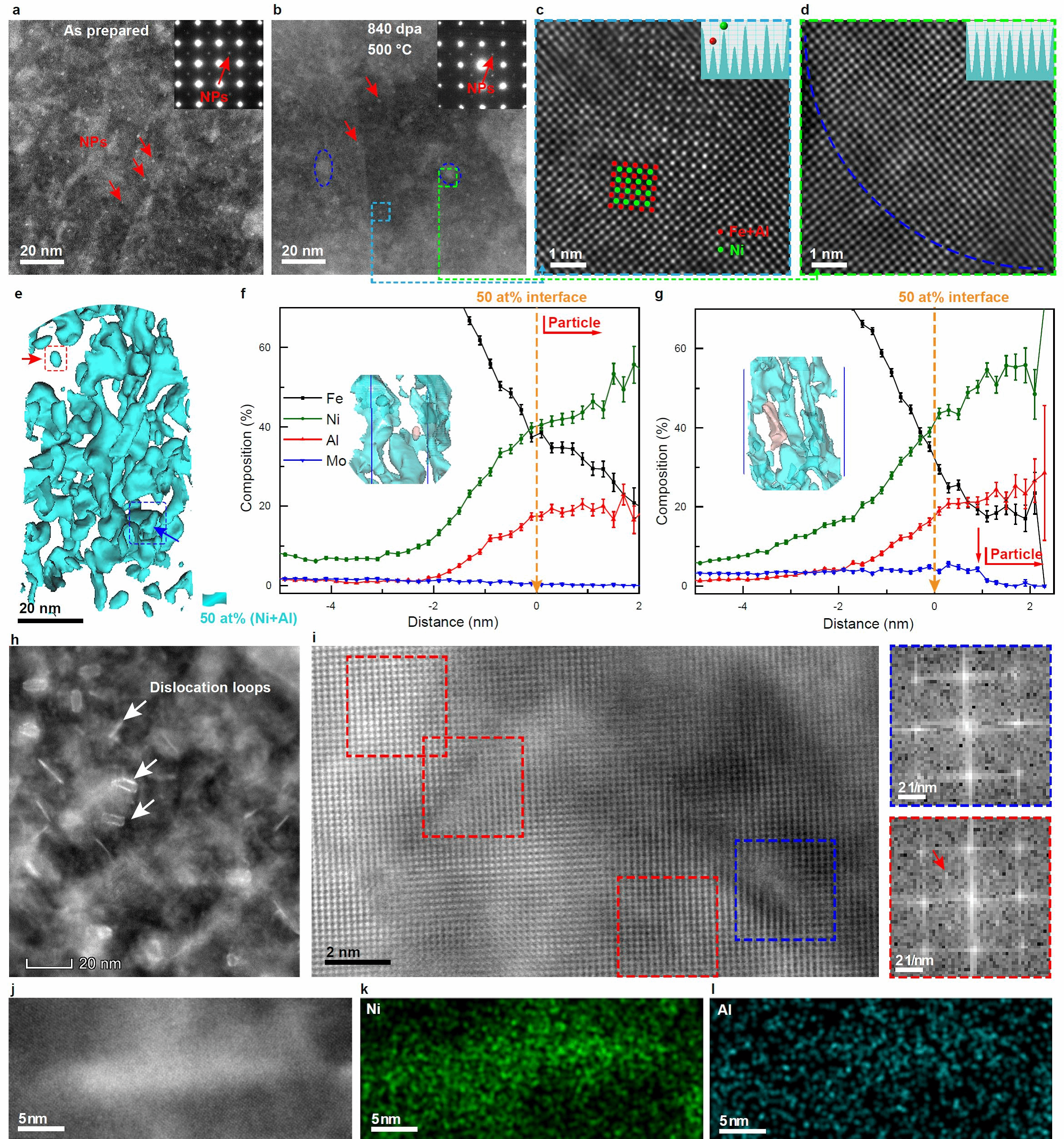 要点:1. 高温辐照前后析出相尺寸、形貌未发生明显变化。相应的原子分辨HAADF-STEM图显示辐照后其有序结构得以保留,同时观察到富Ni区域,结合原子分辨STEMAPT分析可以发现,富Ni区域表现出无序结构,同时在这些富Ni区域内部可以观测到有序纳米粒子;2. HAADF-STEM图可以观察到辐照引入位错环及与位错环相邻的有序纳米粒子存在,辐照引入的位错被纳米粒子有序-无序转变后修复,EDS分析表明修复后的位错环痕迹富Ni,而Al则均匀分布。)