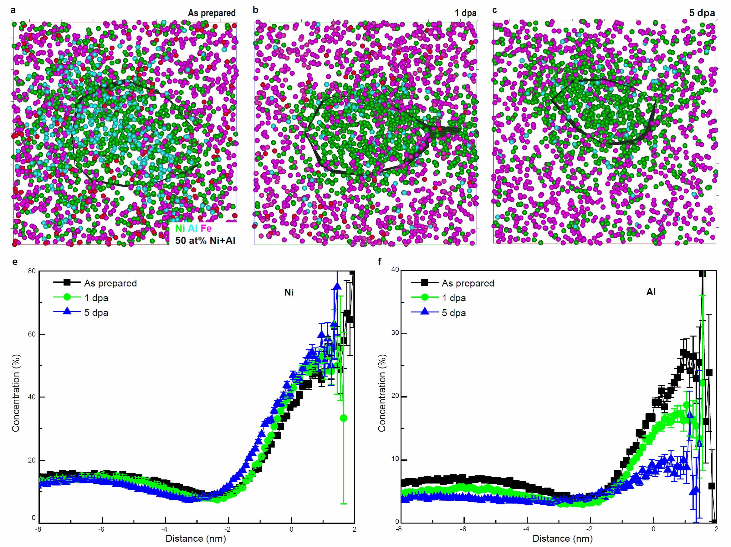 要点:1. 为了充分了解动态溶解和再析出过程,对材料进行了室温辐照实验以揭示纳米粒子溶解过程;可以看到:在辐照达到5 dpa后粒子完全溶解;2. 溶解过程为Al被快速从析出相中敲出。)