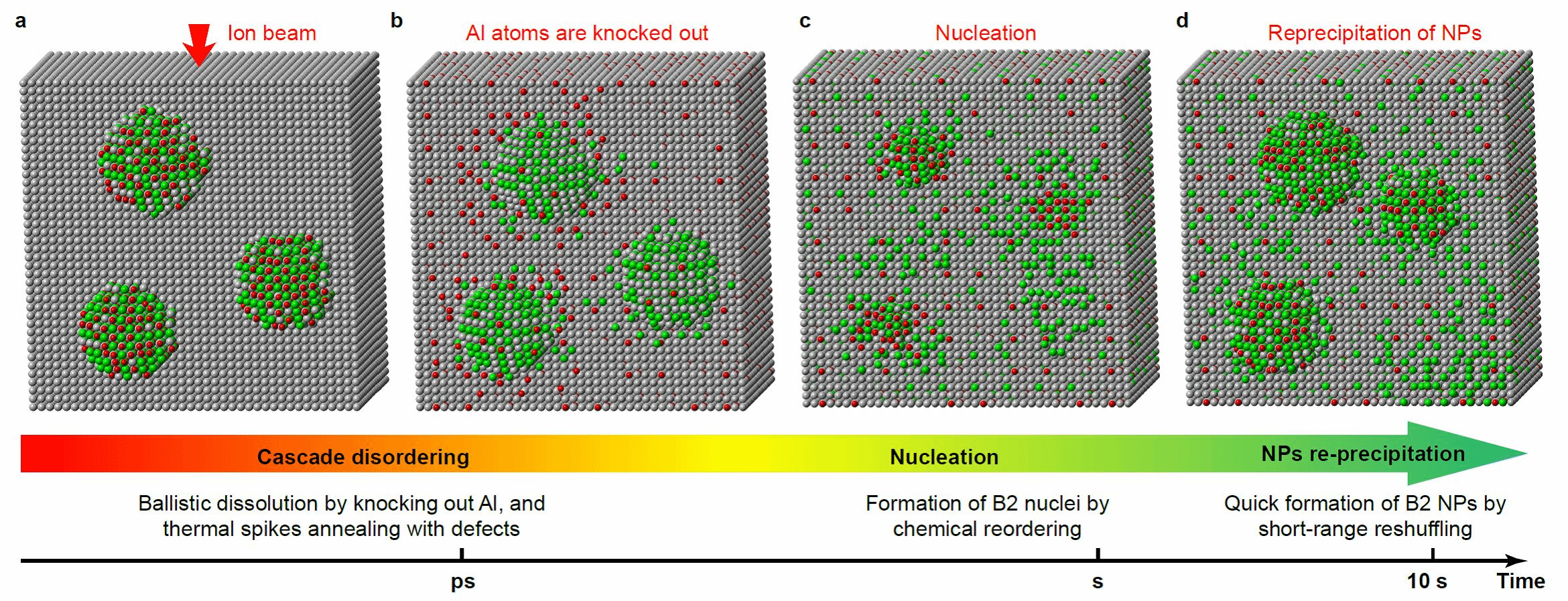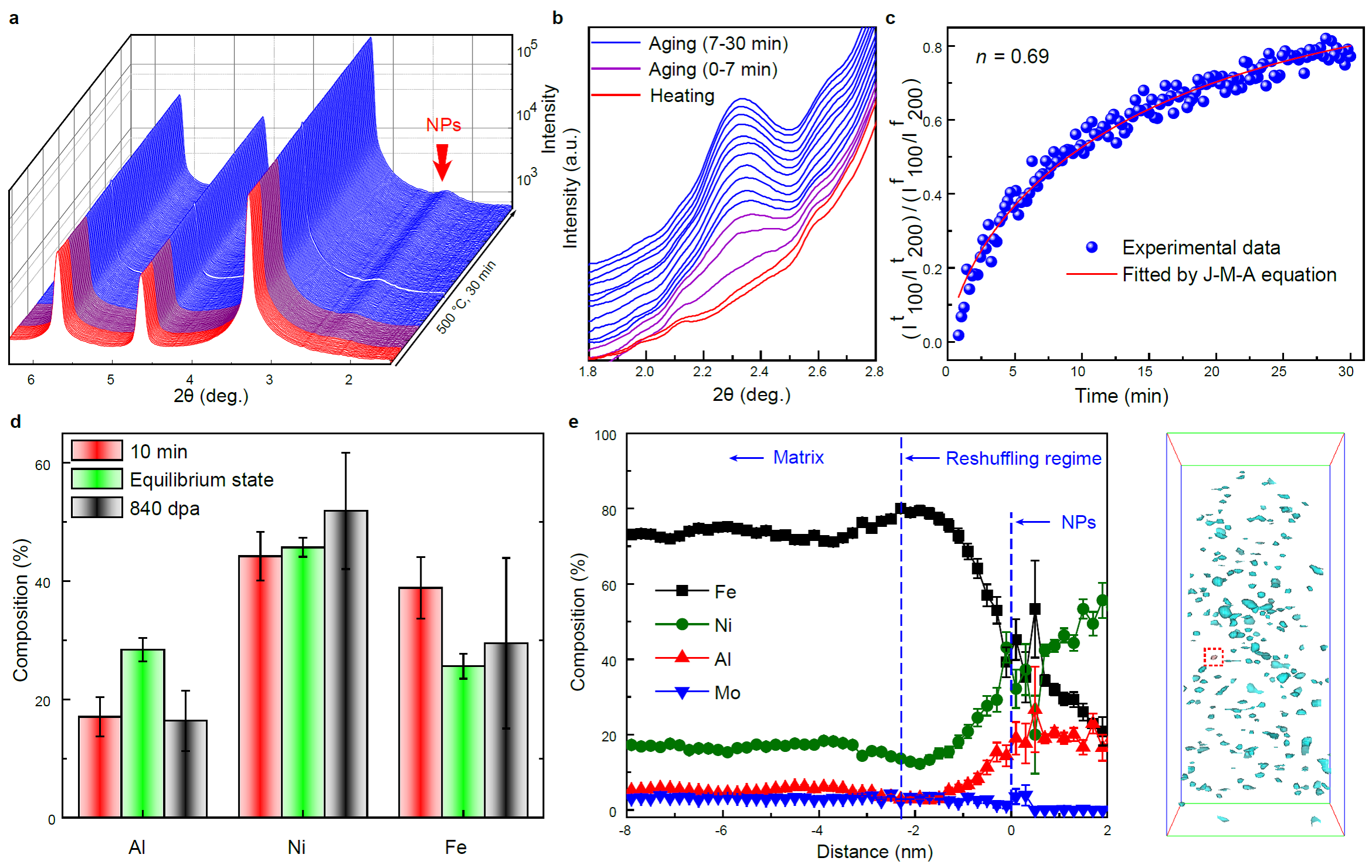要点:1. 把辐照和温度的协同作用区分开,单独研究温度作用下有序纳米粒子的析出行为。原位同步辐射XRD结果表明辐照引起了析出相的快速析出,实验上可以看到在12秒后即可观测到有序纳米粒子信号;2. 对比辐照前样品、高温辐照样品和不含析出相样品经过10分钟同样温度时效后的纳米粒子成分,可以看出后两者Al含量类似,且均低于辐照前样品中有序纳米粒子的Al含量,佐证了辐照条件下的析出相持续的发生动态有序-无序转变。)