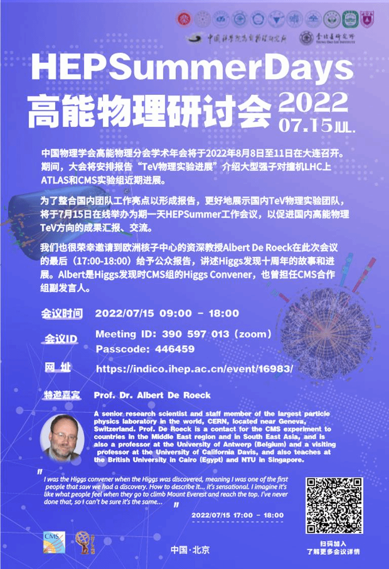 2022715日,高能量物理前沿学术研讨会暨大型强子对撞机ATLASCMS中国组学术交流研讨会通过在线方式成功举办(https://indico.ihep.ac.cn/event/16983)。