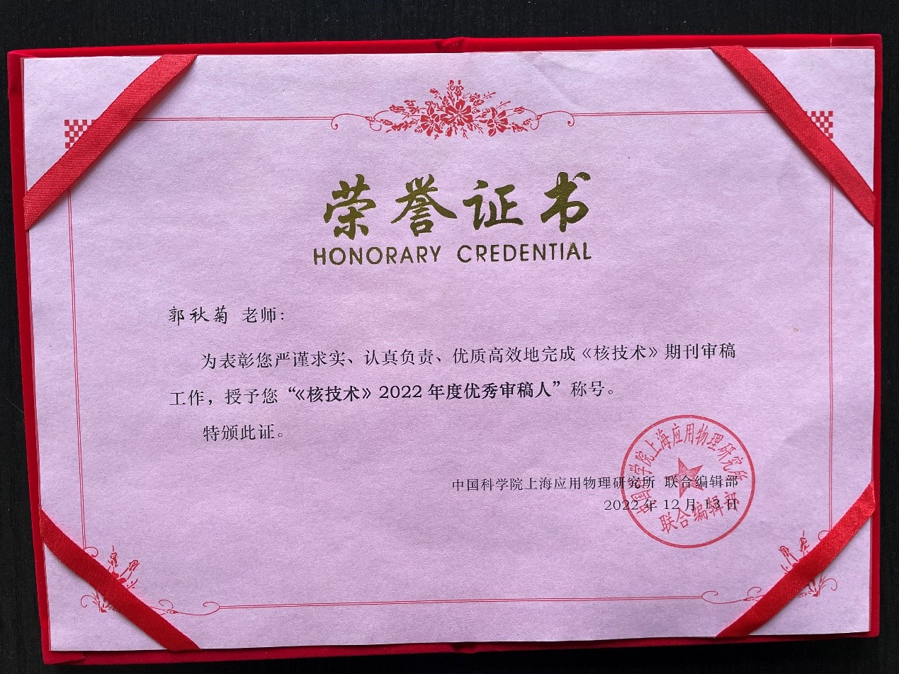 近期,北京大学物理学院技术物理系、核物理与核技术国重郭秋菊教授获评《核技术》2022年度优秀审稿人,以表彰其严谨求实、认真负责、优质高效地完成期刊审稿工作。同时获评的年度优秀审稿人还有四川大学杨朝文教授、南京航空航天大学常树全教授、上海交通大学柴翔研究员、南华大学赵鹏程副教授和中国科学技术大学阴泽杰教授。