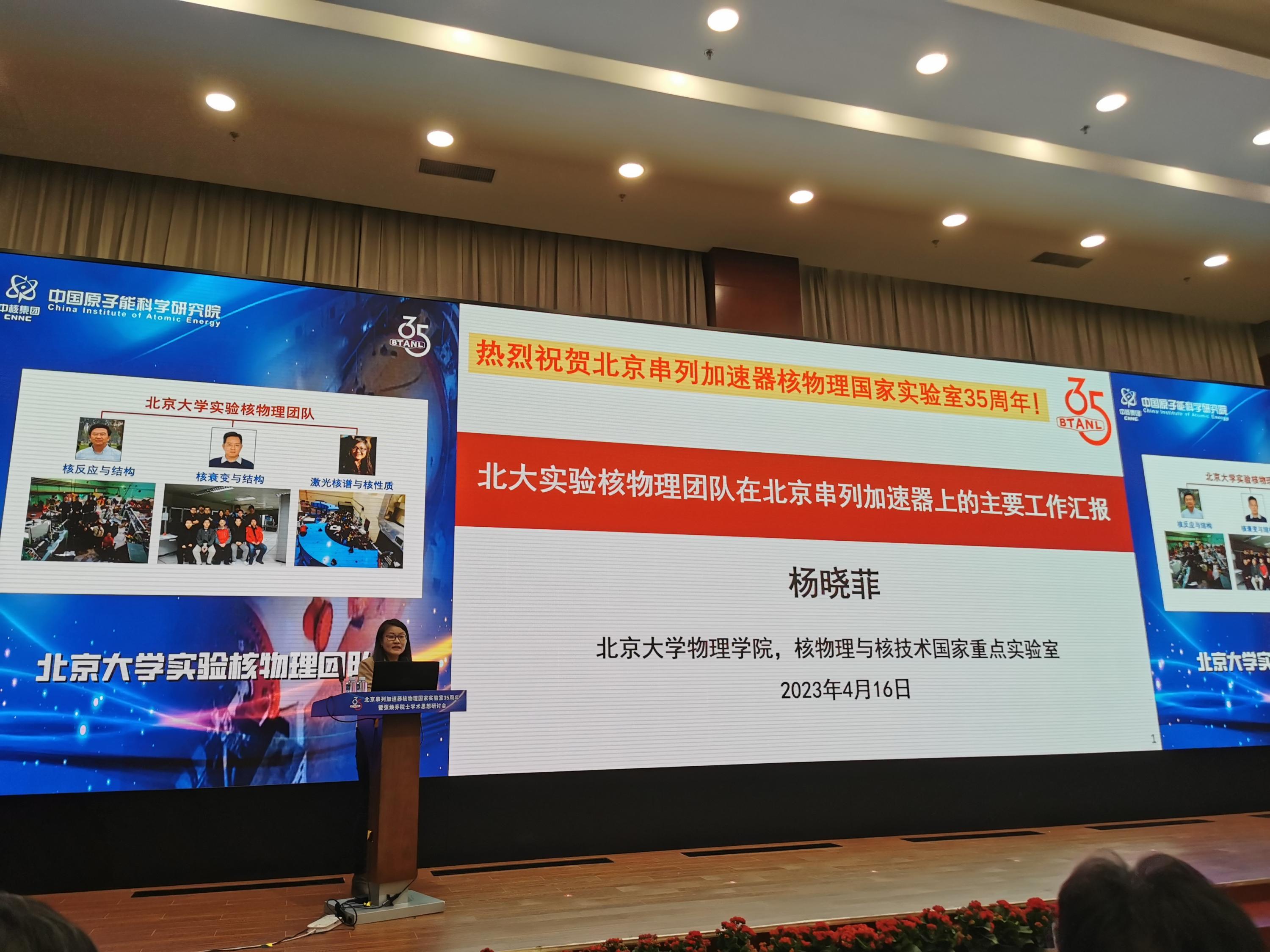 2023年4月16日,中国原子能科学研究院召开了北京串列加速器核物理国家实验室35周年暨张焕乔院士学术思想研讨会。会上宣布了串列实验室35年杰出贡献奖,包括个人奖1项,团队奖7项(基础研究方面3项,应用研究方面3项,加速器装置运行1项)。北京大学实验核物理团队荣获杰出贡献团队,杨晓菲研究员代表团队领奖并作了获奖报告。