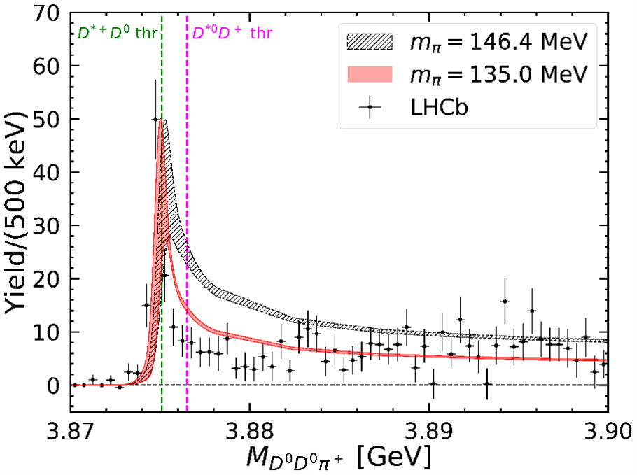 图2. D0D0π+质量谱(红色带和黑色带为理论计算结果,黑色点为LHCb的实验数据)