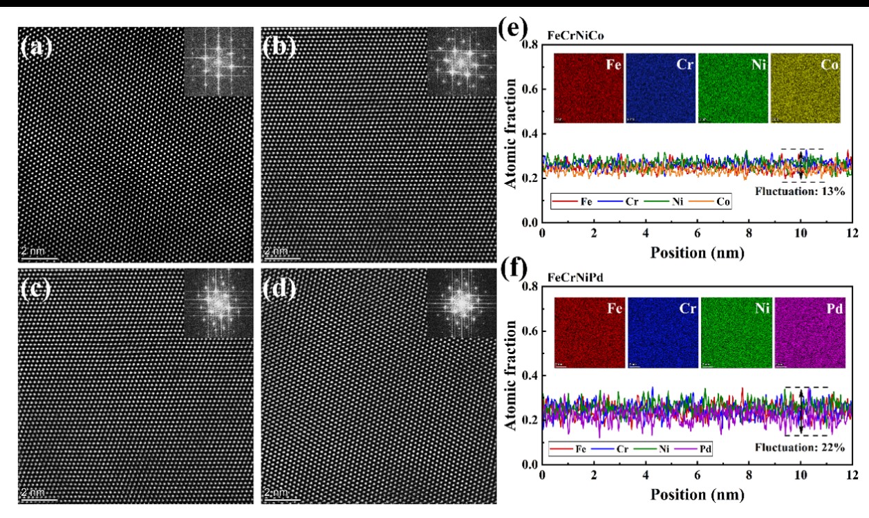 反应堆结构材料长期服役于高温、高剂量辐照、强氧化腐蚀等极端环境,传统合金已经不能满足下一代先进核反应堆的服役需求,成为限制核能领域发展的“卡脖子”难题。高熵合金(High-entropy alloys, HEA)是以多种过渡族金属元素作为组元的新型固溶体材料,具有独特的力学、物理和化学性质,尤其在高温力学、抗辐照等方面表现出优异的性能。目前,在高熵合金中,通过固溶“尺寸差异”原子从而引入额外的化学有序性或晶格畸变是一种提高其机械性能和抗辐照性能的有效策略。例如,浙江大学余倩教授等报道了一种新的含Pd高熵合金,由于其独特的局部化学有序结构,使其展现出显著优于传统Cantor合金的机械性能(Tuning element distribution, structure and properties by composition in high-entropy alloys, 2019, Nature);在抗辐照性能方面,西安交通大学卢晨阳教授等报道了在NiCoFeCrPd中观察到的位错环尺寸比NiCoFeCrMn小,这是由于NiCoFeCrPd中的局部晶格畸变较高(Enhanced void swelling in NiCoFeCrPd high-entropy alloy by indentation-induced dislocations, 2018, Materials Research Letters)。但是,由Pd合金化引入的局部化学有序和晶格畸变对高熵合金抗辐照性能,尤其是对氦(He)气泡生长演化、辐照硬化机制的影响规律还尚未得到系统阐明。