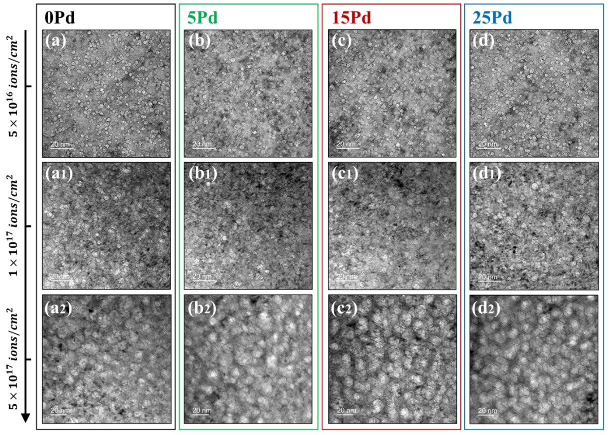 图2:不同Pd含量高熵合金(x = 0,5,15,25)中经过不同He离子辐照剂量(5×1016, 1×1017, 5×1017ions/cm2)后的He泡微观形貌