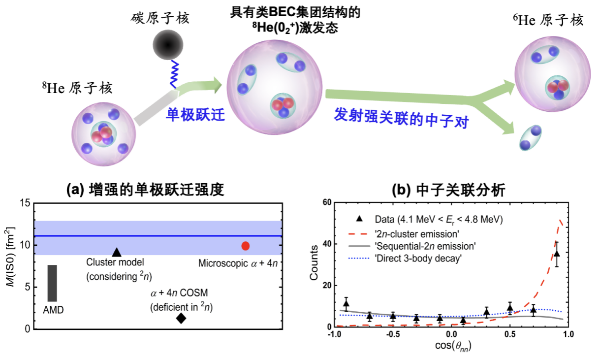 北京大学实验核物理团队采用了单极跃迁这种独特的核反应手段来研究8He中具有中子凝聚态结构的02+激发态。2009年,北京大学实验核物理团队提出并主导在日本理化学研究所的放射性束流装置上开展的8He的非弹激发与衰变实验。部分8He原子核与碳靶作用发生单极跃迁从而生成02+共振态,该态随即衰变为一个6He原子核和一对中子,并被磁谱仪和专门设计的中子探测器阵列所探测。研究团队通过深入分析反应及衰变过程中的粒子关联效应,区分了多中子参与的复杂反应与衰变机制,从而排除复杂的本底过程,最终清楚识别了02+激发态。进一步的分析表明,它的生成过程具有很强的单极跃迁强度、并通过发射强关联的中子对发生衰变,这些特征与理论预言相符,从而确认了它的类BEC集团结构。这是首次在实验上观测到由强关联中子对凝结形成的类BEC集团结构,揭示了丰中子原子核体系的一种新的特性,有助于深入认识不稳定核奇特结构和探索核物质(包括中子星)的性质。