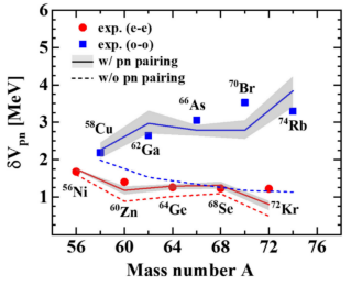 北京大学研究团队建立了统一考虑中子-中子和质子-质子以及中子-质子对关联、严格处理堵塞效应、保持粒子数守恒的相对论多体理论方法,微观自洽处理中子-质子对关联,成功再现了中国科学院近代物理研究所观测到的原子核结合能双重差分的反常分叉现象,揭示了原子核中存在中子-质子对关联的信号。