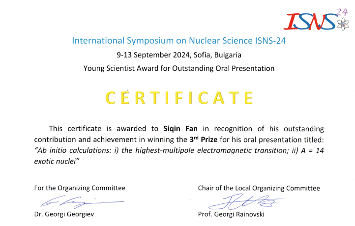 ISNS-24核科学国际会议于2024年9月9日至13日在保加利亚首都索非亚举行。会上来自世界各地的科学家作了关于核科学各个领域的前沿研究报告。会上从近20位青年报告者中评选出三位最佳青年报告奖,同时从海报中评选出三位最佳海报奖,分别授予获奖证书和奖金。