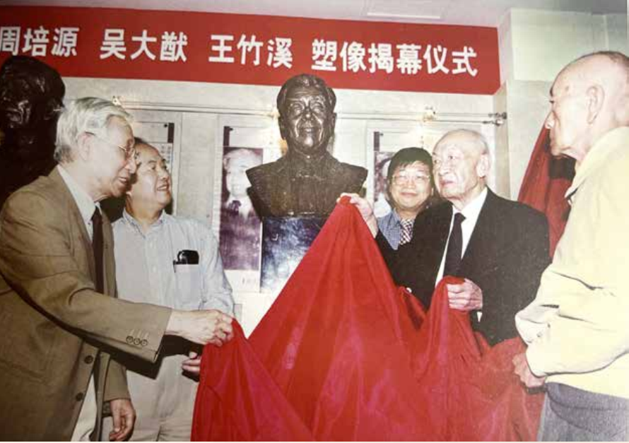 2003年9月15日,朱光亚(右二)、马大猷(左一)、李政道(左二)、黄昆(右一)等在北京大学物理学院出席饶毓泰、叶企孙、周培源、吴大猷、王竹溪塑像揭幕仪式