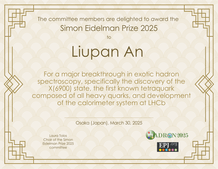 2025年3月30日,在日本大阪召开的第21届强子谱学与结构国际会议上,北京大学物理学院技术物理系助理教授安刘攀获2025年度Simon Eidelman奖,以表彰其因发现全粲四夸克态X(6900)而对奇特强子谱学研究带来的突破,以及在欧洲核子研究中心大型强子对撞机底夸克实验(LHCb)量能器系统研发工作中的突出贡献。全粲四夸克态X(6900)是首个完全由重味夸克组成的奇特强子态,为理解低能区强相互作用开辟了新的研究平台。