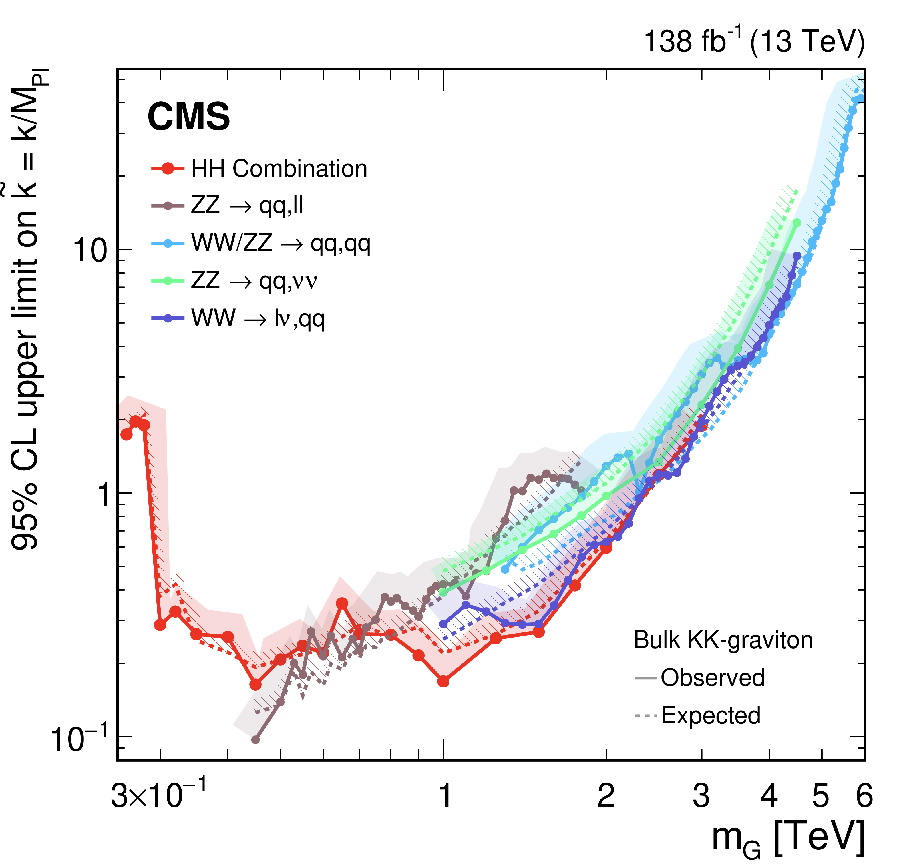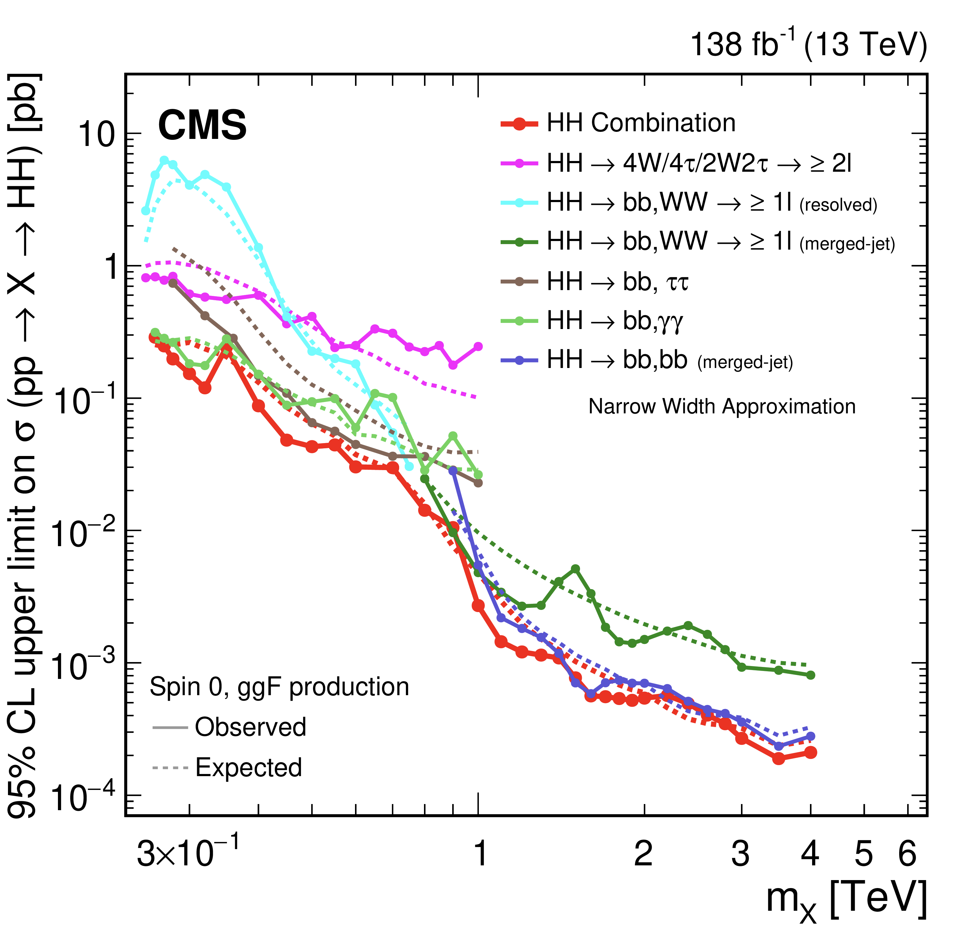 CMS合作组使用LHC二期运行数据,总结、联合诸多的衰变道,得到了希格斯玻色子共振产生的截面上限。此结果与标准模型预期无明显偏差,并在很大的质量范围内给出了目前为止最严格的限制。基于希格斯玻色子共振产生的截面上限,CMS合作组进而对相关的新物理模型进行了诠释,给出了模型参数空间的实验约束,并与其他新物理寻找渠道的结果形成了很好的互补。