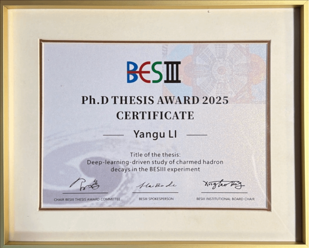 自2022年以来,BESIII合作组每年从数十篇博士毕业论文中评选2~4篇博士论文授予该奖项,以表彰获奖者在实验软硬件开发、科学计算、物理分析等方面做出突出贡献。物理学院2022届博士毕业生、现瑞士洛桑联邦理工大学研究员宋昀轩亦曾获该奖项。