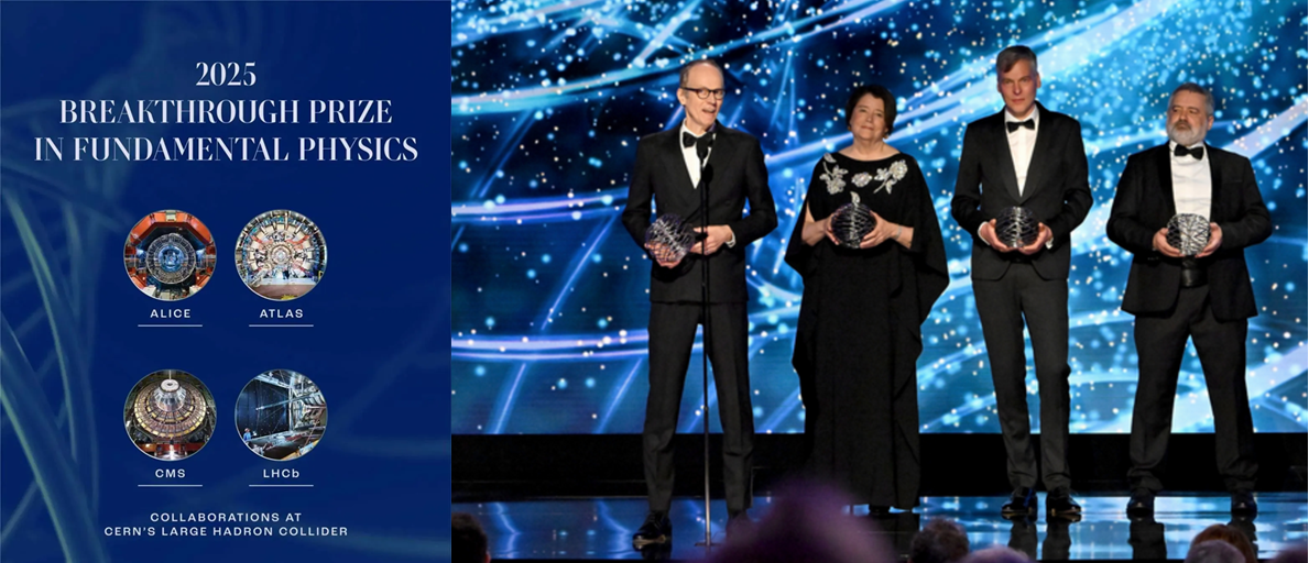 欧洲核子研究中心大型强子对撞机(LHC)大型离子对撞机实验(ALICE)、超环面仪器实验(ATLAS)、紧凑缪子线圈实验(CMS)、底夸克探测器实验(LHCb)合作组,因“在欧洲核子研究中心大型强子对撞机上,精确测量希格斯玻色子特性以验证质量起源的对称性破缺机制,发现新型强相互作用粒子,研究稀有过程和物质-反物质不对称性,以及在最短距离与最极端条件下探索自然”(for detailed measurements of Higgs boson properties confirming the symmetry-breaking mechanism of mass generation, the discovery of new strongly interacting particles, the study of rare processes and matter-antimatter asymmetry, and the exploration of nature at the shortest distances and most extreme conditions at CERN’s Large Hadron Collider),被授予“基础物理学突破奖”(Breakthrough Prize in Fundamental Physics)。