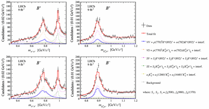 B+和B-衰变末态的两体不变质量谱及拟合,其中ρ(770)0 和K*(892)+分别出现于π+π-和KS0π+质量谱。B+→ ρ(770)0 K*(892)+衰变(蓝实线)及其反过程产额显著不同,呈现CP破坏。